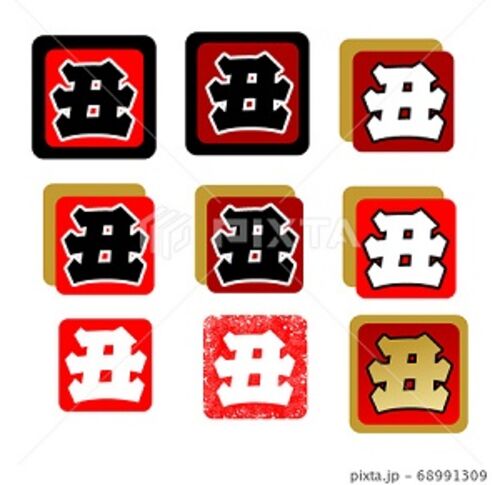 丑年, 干支, 文字, 年賀状素材, イラスト, pop, ハンコ, 年賀状, 正月, 新年, 漢字, 丑, 十二支, アイコン, マーク, 素材, デザイン